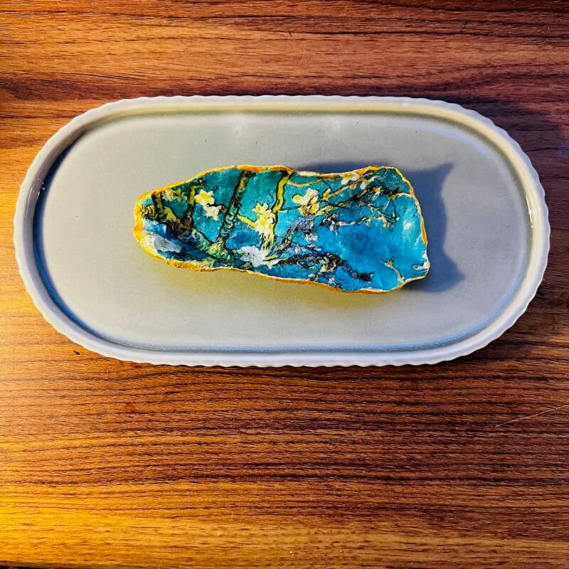 Op de Kerstmarkt in Schaarsbergen kocht ik een met de amandelbloesems van Van Gogh beschilderde schelp, verkocht door Club Arnhem van Soroptimist. Dat is een organisatie die zich inzet om de rechten, de positie én het leven van vrouwen en meisjes wereldwijd te verbeteren. De opbrengst van deze verkoop gaat naar de Ankobea Hemea Asiedua Foundation in Kitase, Ghana dat als doel heeft om meisjes tussen de 15 en 24 jaar, die niet in de gelegenheid zijn geweest om een schoolcarrière te doorlopen, een vak te leren zodat zij op den duur zelfstandig kunnen voorzien in hun levensonderhoud.