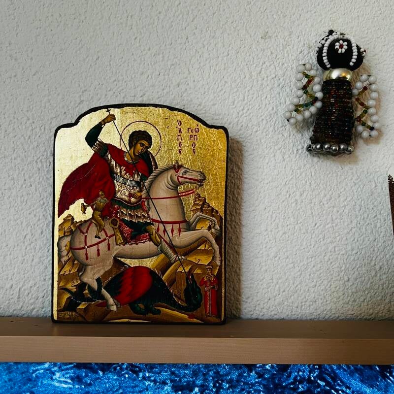 In het Agios Stefanos klooster in Meteora kocht ik een icoontje van Sint Joris, omdat me verteld was dat dit icoon een sterke beschermer is van huis en gezin. Gisteren echode Sint Joris in Rosmalen toen ik hem in het portaal van de Lambertus zag.