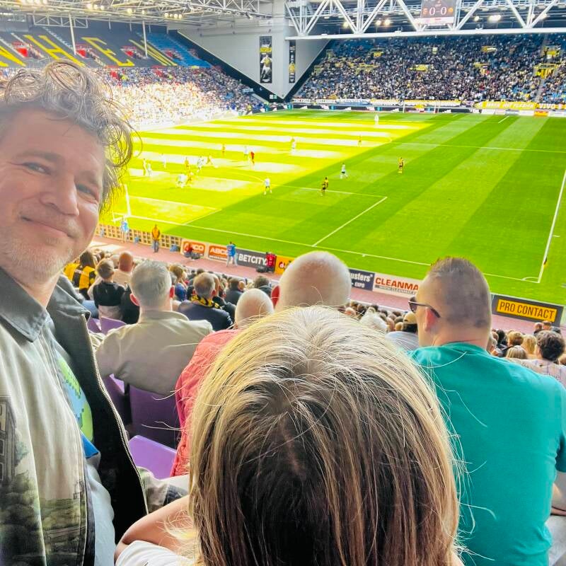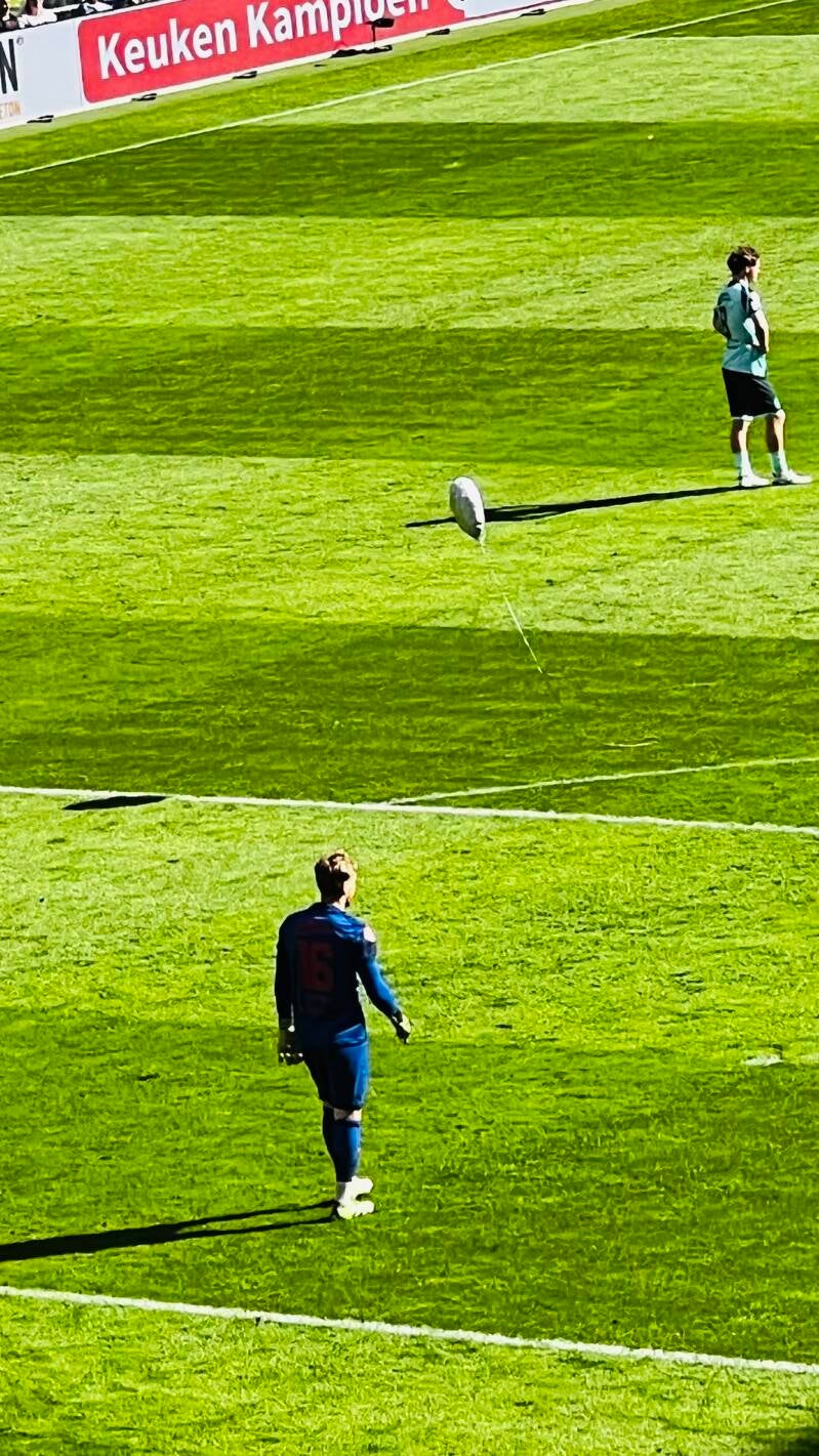 Met B. naar Vitesse-Roda JC (3-0 gelukkig). Mooiste moment was een verloren heliumballon die traag het veld op zweefde en bleef hangen boven de keeper van Vitesse, tot een grensrechter ingreep en de ballon buitenspel bracht.