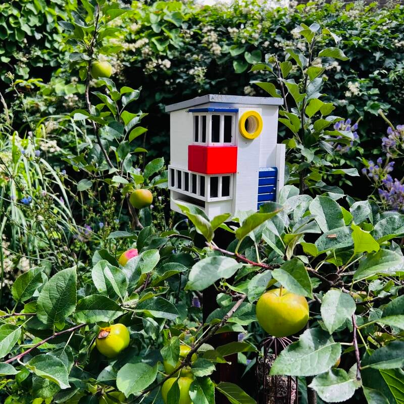 Tussen de appels in de achtertuin heeft Rietveld een vogelhuisje gebouwd.