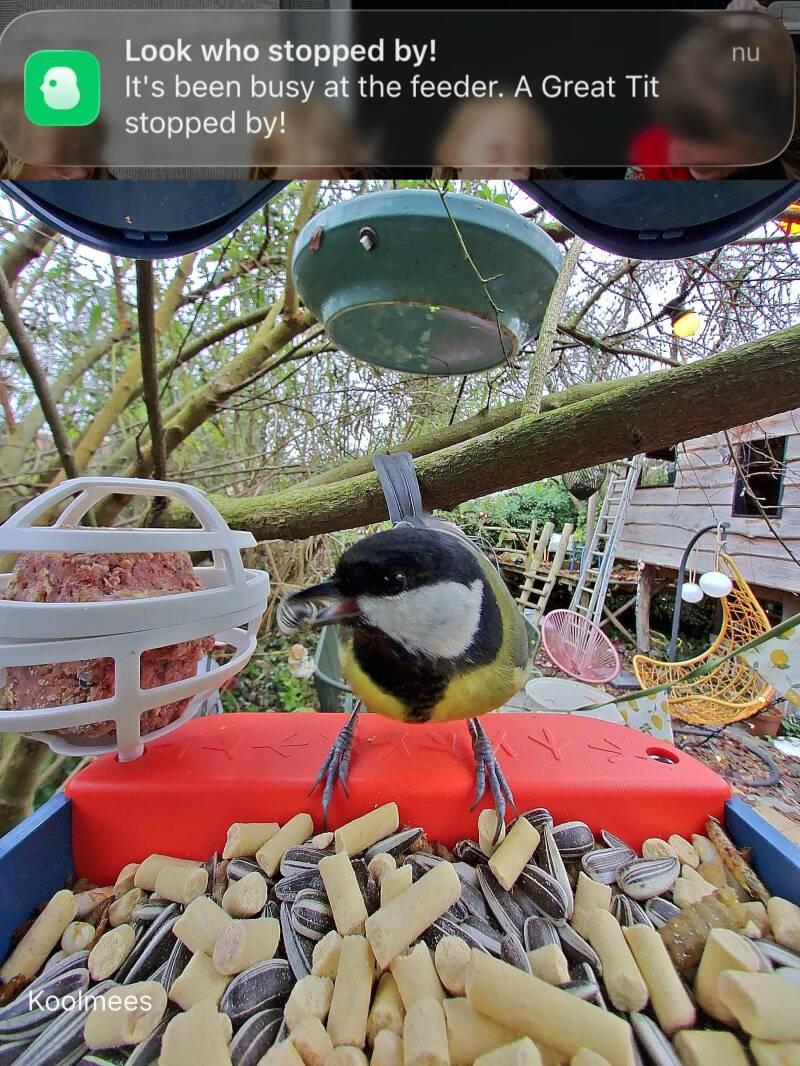 We hebben een voederbakje met camera opgehangen. De eerste bezoeker is een koolmeesje, of, zoals 'ie zich in het Engels laat noemen, A Great Tit!