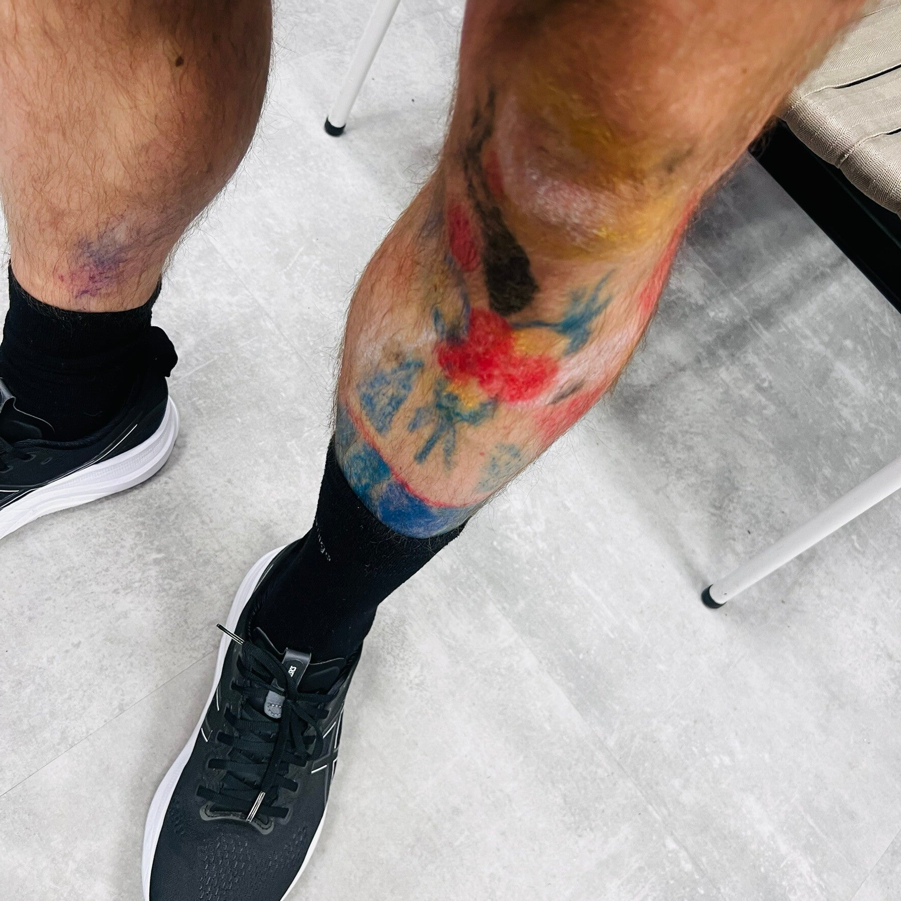 Ik vergeet ook vaak dat ze op mijn benen staan, haar kunstwerken, waardoor ik ook regelmatig op de spotschool met tekenbenen op de loopband sta...