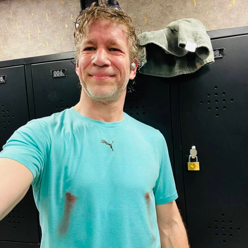 Ik vergeet elke keer dat dit shirt niet geschikt is voor langere afstanden. Na vijf kilometer begint het schuren, op vijftien kilometer zie je er zo uit...