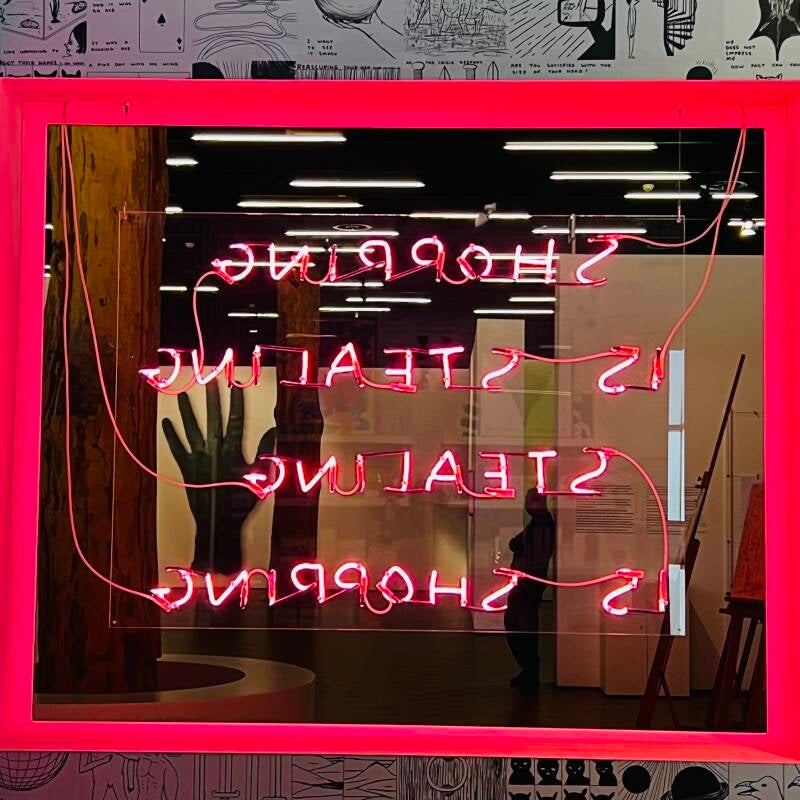 Ook is er, nog even, What the Hell was I thinking van David Shrigley te zien. Een vermakelijke tentoonstelling die je denken af en toe wil kantelen - met een oorlog tussen pluisjes, eensnarige gitaren, een kermisattractie waarbij je gevraagd wordt aambeelden om te gooien met pingpongballen en een merch-winkeltje dat kunstwerk en commercie tegelijk is.